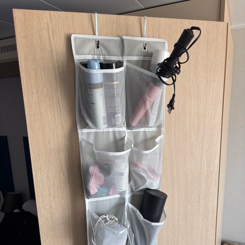 Cruise cabins are short on storage, but an over-the-door organizer is a clever solution. These organizers are designed for shoes but perfect for keeping small items like sunscreen, hairspray, curling irons, medications, and other toiletries neatly tucked away. By hanging it on the inside of your closet or bathroom door, you free up precious counter space and keep everything easily accessible. It’s a simple yet effective way to stay organized and avoid clutter in your cabin.