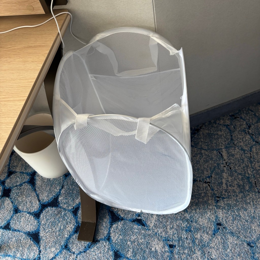 Cruise cabins are notoriously small, so anything to help tidy up is a winner in my book! Keeping dirty clothes organized is a challenge, so a pop-up laundry hamper is an absolute must-have. It folds down flat for easy packing but expands to hold a week’s worth of laundry. This keeps your cabin tidy and makes packing up to go home much easier.